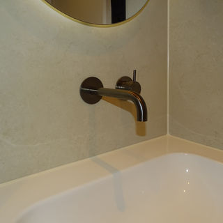 Deze badkamer in Amsterdam heeft een eigentijdse renovatie ondergaan, waarbij de inloopdouche is voorzien van stijlvolle Newark Moka decor tegels. Het gebruik van Hotbath Aged Iron kranen geeft de ruimte een stoer, luxe karakter. De combinatie van de warme tinten van de tegels en de verfijnde kranen zorgt voor een badkamer die zowel stijlvol als comfortabel is, perfect voor dagelijks gebruik.
