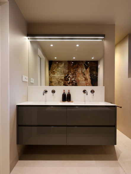 Bottega Caliza natuursteen vormt de basis van de douchehoek, terwijl in de nis een verfijnd accent van Jaspe Rouge is toegepast. Deze warme tint keert terug bij het bad, waardoor er een harmonieus geheel ontstaat. De vloer is gelegd met royale Bottega Caliza 120×120 tegels, wat het aantal zichtbare voegen minimaliseert en de badkamer een ruimtelijker uitstraling geeft.