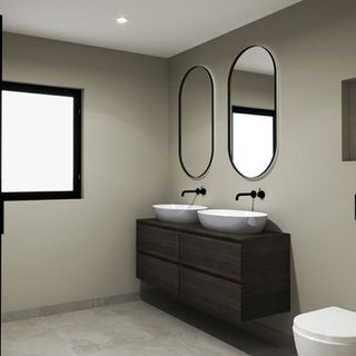 Voor deze badkamer is gekozen voor een rustgevende uitstraling met houtdecor tegels, die een warme en natuurlijke sfeer creëren. Het stucwerk op de muren zorgt voor een strak en modern contrast, terwijl de gunmetal kranen een subtiele, luxe afwerking toevoegen. Gedeeltelijk stucwerk in een badkamer is een slimme keuze, omdat het vaak voordeliger is dan het volledig betegelen van de ruimte en toch een strak en stijlvol resultaat biedt.