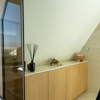 De klant koos in de badkamers voor de elegante Prada White tegels van Porcelanosa, gecombineerd met robuuste Aged Iron kranen van Hotbath. De Sanibell waskommen voegen een modern element toe, terwijl de Sunshower Black zorgt voor een wellness-ervaring in eigen huis. Daarnaast zijn de Bottega Caliza tegels gebruikt om extra textuur toe te voegen, wat de ruimtes harmonieus maakt.